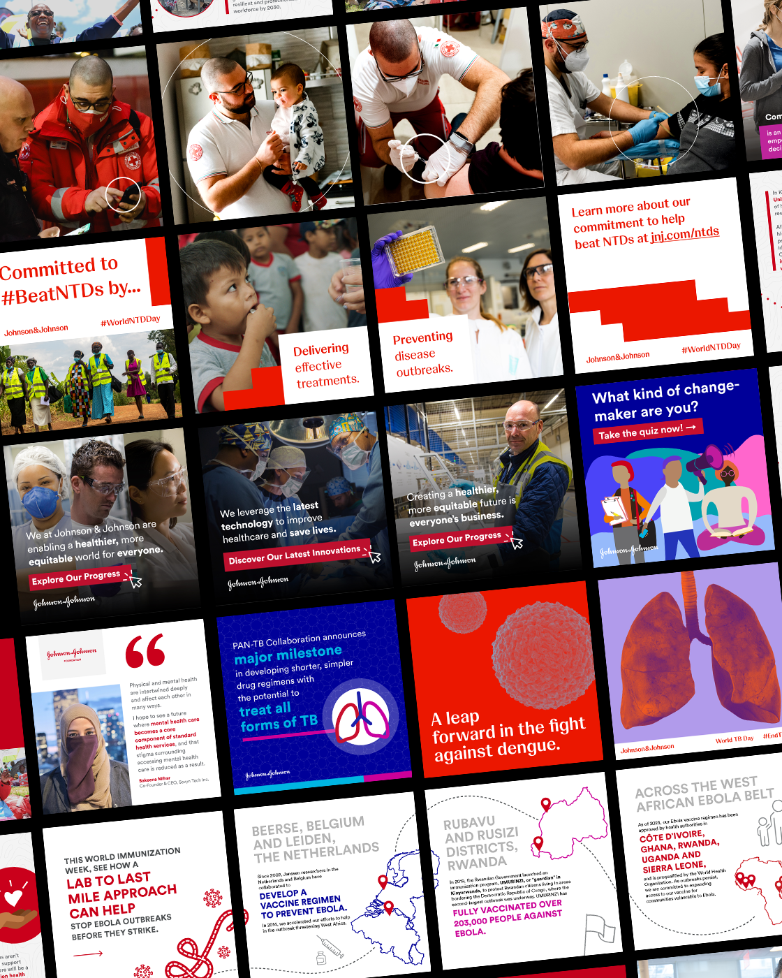 For nearly seven years, I partnered with Johnson & Johnson’s Global Community Impact division to elevate its leadership in global health. Leading creative direction, digital strategy, and content across multiple teams, I helped amplify initiatives supporting women and girls, strengthening the global health workforce, and addressing preventable disease. I directed more than ten national and international content captures, creating a scalable library of photography and video used across campaigns, events, and partner toolkits. I also led creative for Johnson & Johnson’s One Young World presence for four years and oversaw content strategy for @JNJGlobalHealth—building cohesive, mission-driven storytelling that inspired engagement and action.